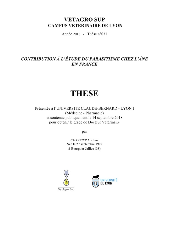 | Contribution à l’étude du parasitisme chez l’âne en France / CHAVRIER Lorianne, 2018 | |||||||
